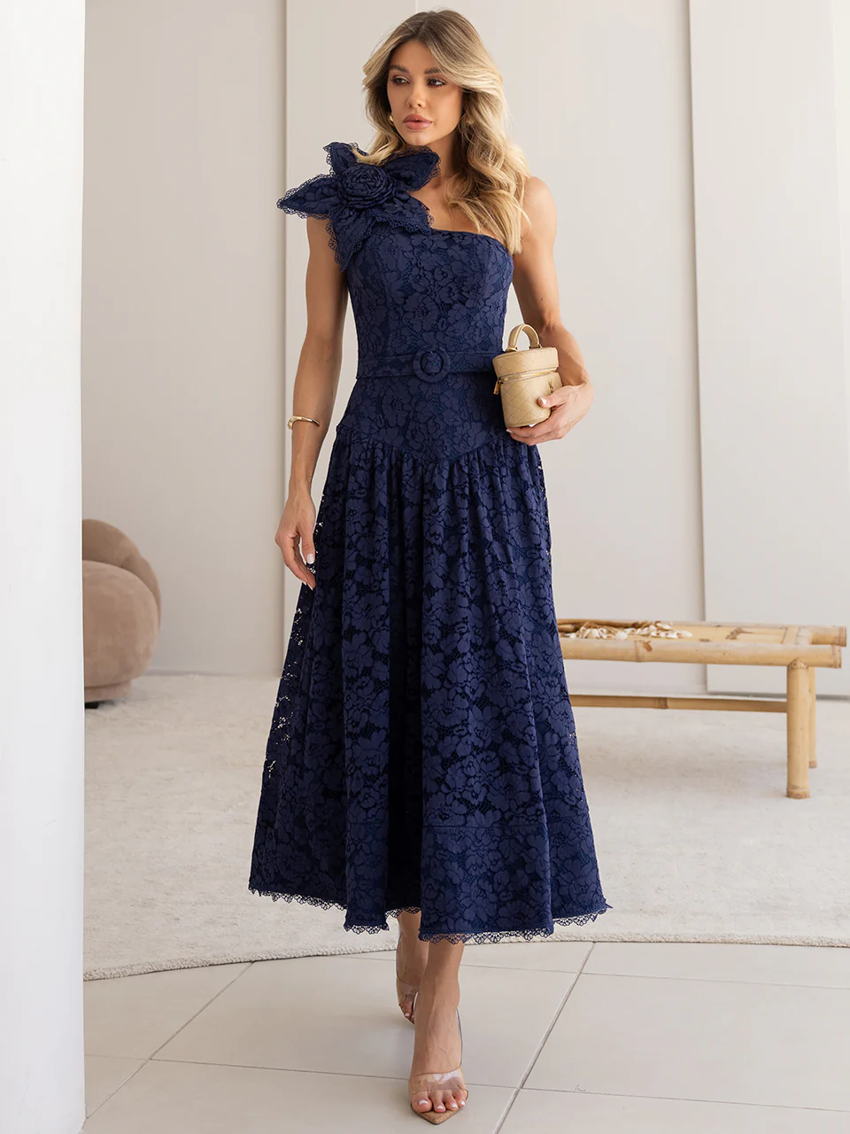 Vestido midi em renda azul marinho, com decote assimétrico, modelagem ajustada no corpo e saia fluida. A aplicação de flor feita artesanalmente no ombro valoriza o design e traz sofisticação à peça. A renda rica em textura acompanha a tendência do romantic couture, em destaque no Verão 2026. Um vestido elegante e marcante, ideal para eventos especiais e ocasiões que pedem um visual refinado. Zíper de metal nas costas