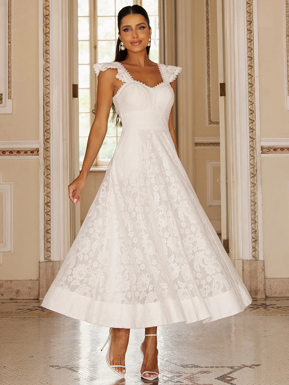 Este vestido midi em renda branca é uma escolha sofisticada para casamento civil, especialmente para noivas que buscam um visual romântico, elegante e atemporal. A renda floral e a modelagem evasê criam um look delicado e memorável, ideal para cerimônias civis, pré-wedding ou celebrações intimistas.