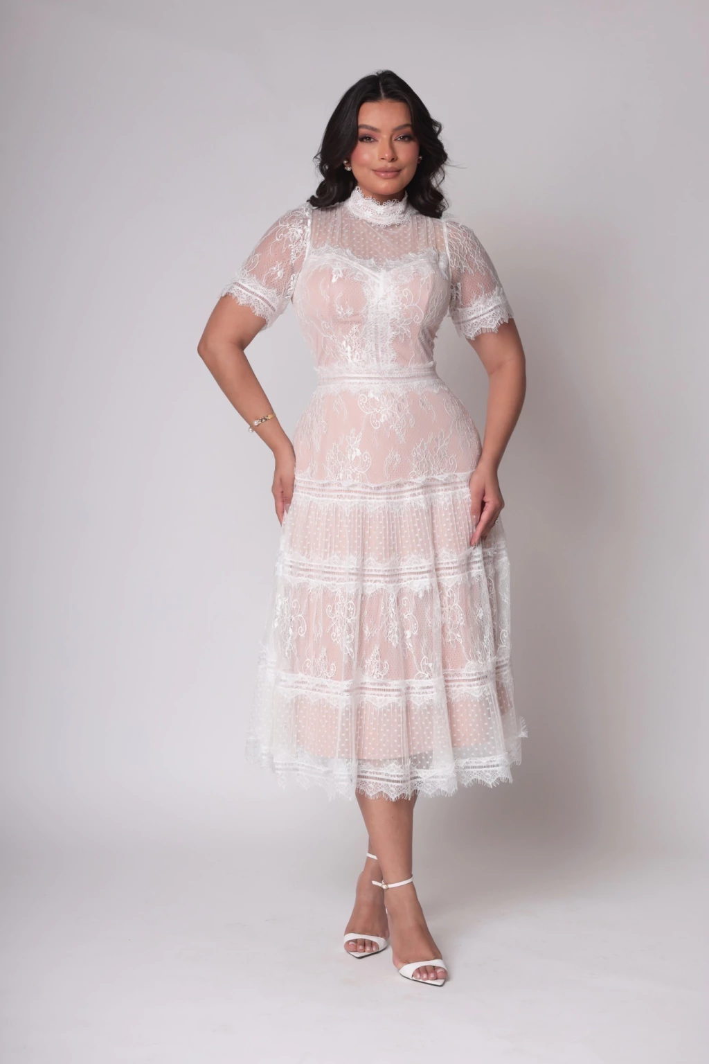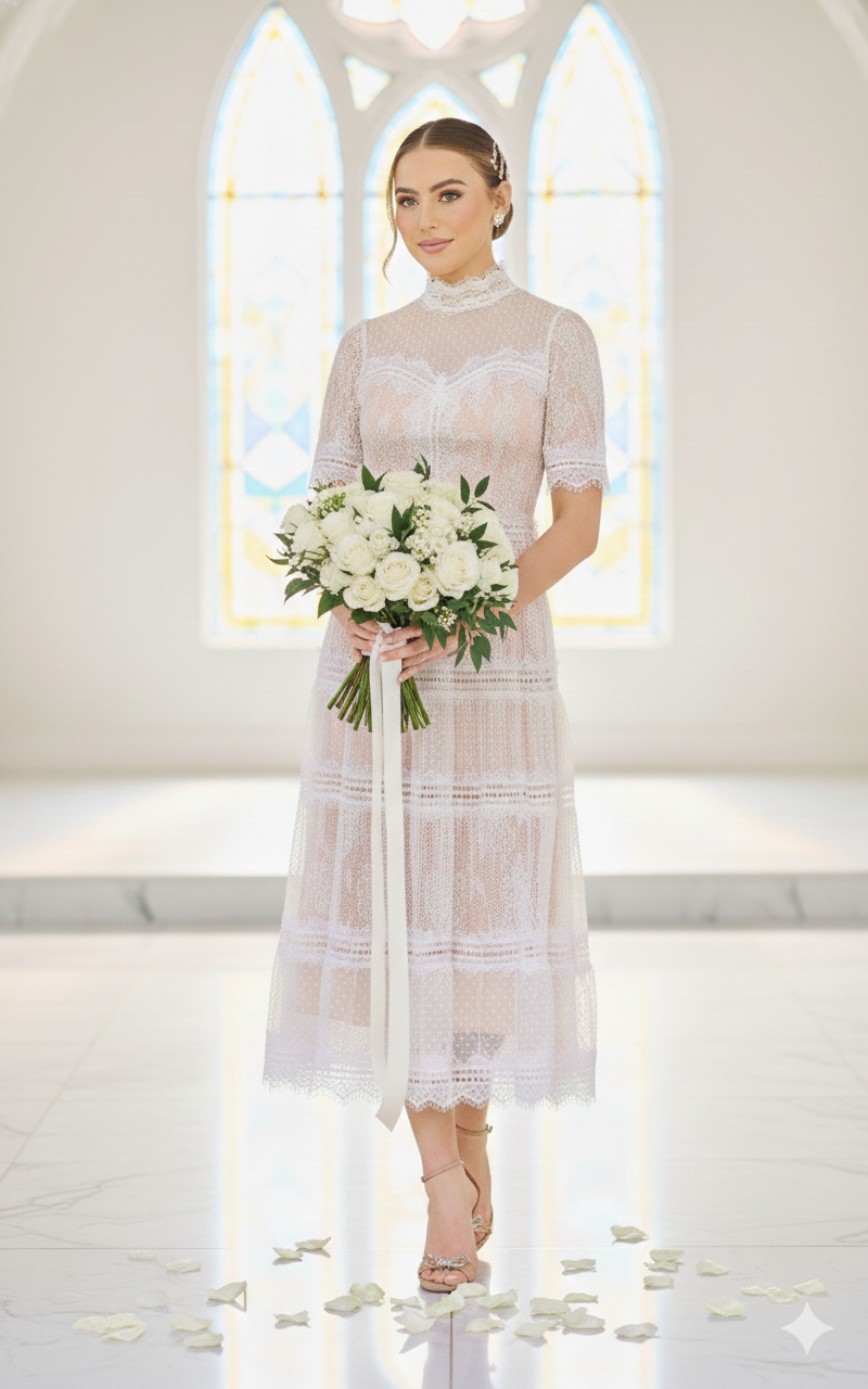 Uma peça que traduz a essência da feminilidade com sofisticação. O vestido mídi da coleção Gravity é confeccionado em renda e tule, com detalhes em guipir que enriquecem a composição. A gola alta, as mangas delicadas e o caimento fluido criam uma silhueta romântica e atemporal.