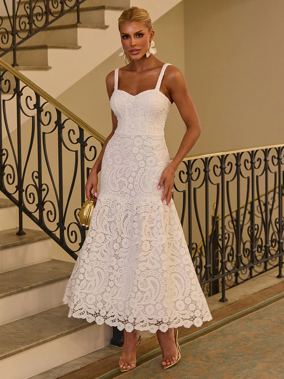 O Vestido Midi Renda Off-white é aquele clássico moderno que ilumina qualquer celebração. Feito em renda trabalhada com desenho floral e arabescos, ele traz uma estrutura de corset no busto, alças rendadas e uma saia midi fluida com recorte godê suave, perfeito para criar movimento e leveza nas fotos.