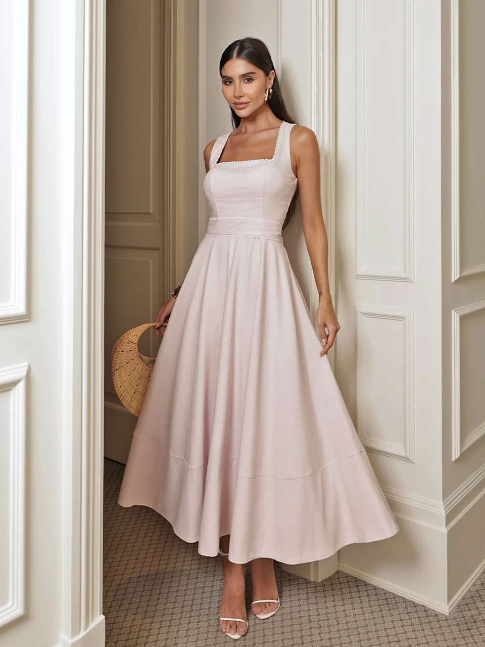 Vestido midi em rosa claro, com decote quadrado, alças largas e cintura marcada que valoriza a silhueta. A saia ampla com barrado garante movimento e leveza, acompanhando a tendência do romantic summer e dos tons suaves, em destaque no Verão 2026. O faixa com laço na cintura acrescenta um toque delicado e feminino, ideal para ocasiões especiais, eventos diurnos e produções elegantes de férias. Fechamento: Zíper de metal nas costas